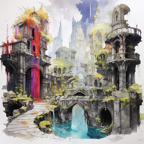 Dungeons and Dragons, Concept art, Dark Fantasy, Haunted Landscape, An Ancient temple used for magical uses and archives. It sits at the base of a mountain with a barren valley below --ar 7:4