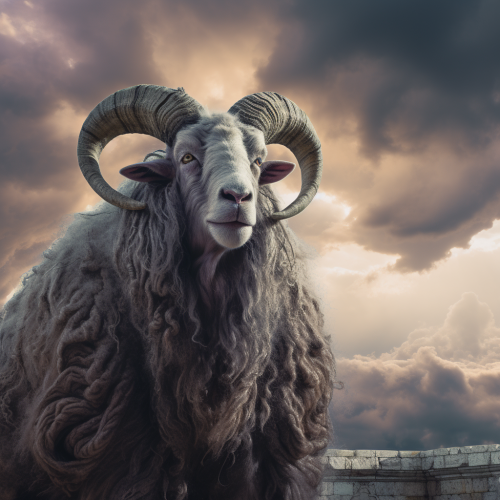 **Botticelli's painting style, goat at herods temple ancient Israel, cinematic, ultra-detailed, perfect composition, moody lighting, 4k, purple and blue tones, dust, Mysterious, emotional, long wide shot, big cloudy sky