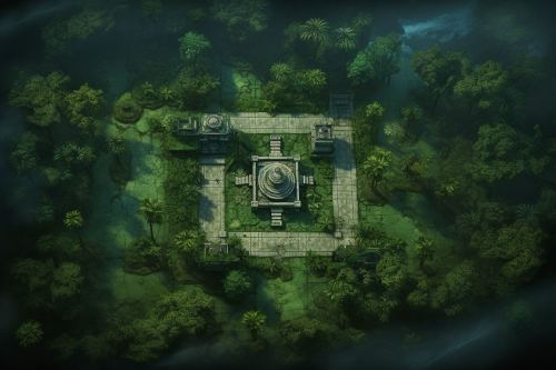 ultra realistic, ultra detailed, rpg map, jungle, without grid showing wooden temple in the middle of tropical jungle, wild, no grid, dark green, drawing --v 5.2 --ar 3:2