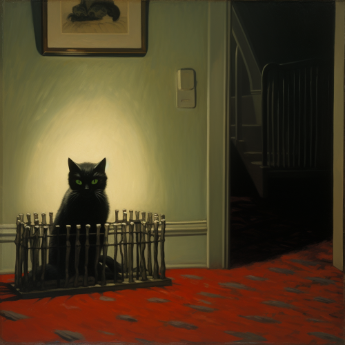 creepy long black cat crouches in lamplit room next to an air return grate, meowing at several small long fingered demon creatures hiding inside the air grate, the room is furnished in 1950decor, the scene is painted with attention to detail, the scene is painted according to the style of the artist by Edward Hopper