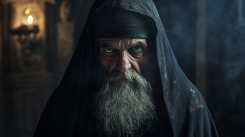 120 year old blind mystic cult gregorrian monk looking in the camera ,angry. in a old hallway ,mist. medieval fire monastry ,cape, big stained colored glass window..in the year 1650. fog, .. very dark ,cult ,Canon EF 50mm f/1. 8 STM Lens | 2077 | realistic | hyperrealistic | raytracing | depth of field | full of color | cinematic | highly detailed | rim lighting,purple,blue,pink. highly detailed, realistic, beautiful, emotional,trending , director rydly scott style, IMAX 70mm camera --ar 16:9 --v 5.2