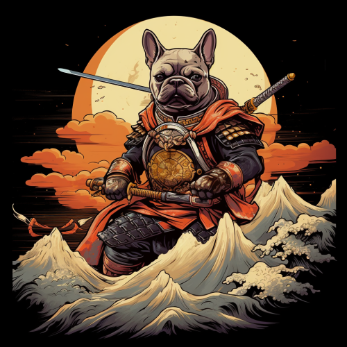 French bulldog riding a horse carrying a sword on his back wearing a traditional samurai, no background, hyper realistic, t shirt design