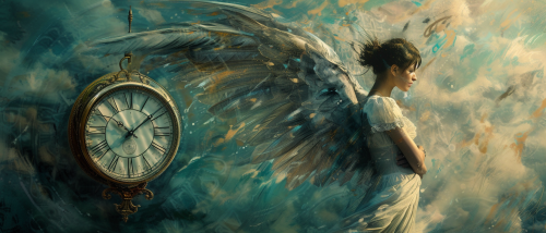 an angel with huge wings, clock, mythical and mysterious --v 6.0 --ar 7:3