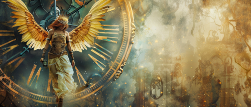 an goddess with huge wings, clock, mythical and mysterious --v 6.0 --ar 7:3
