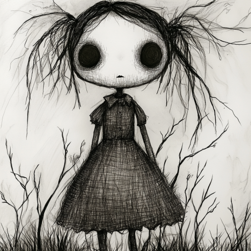 Create a black-and-white illustration of a haunting, doll-like figure inspired by Edward Gorey’s distinctive style. Use meticulous cross-hatching to create depth and shadow, emphasizing the eerie expression and intricate details in the character’s hair and tattered clothing. Render the figure with simplified, exaggerated proportions and a vacant, expressionless gaze that conveys a sense of melancholic mystery. Keep the background minimal, perhaps including only a few shadowed, symbolic elements like pumpkins or barren branches to evoke a Gothic atmosphere. Ensure the overall tone is subtly unsettling, embodying the characteristic emptiness and symbolic motifs of Gorey's work.