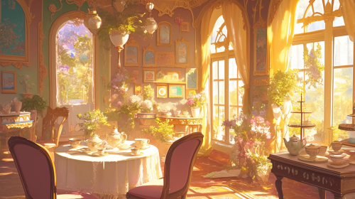 delightful tea room, intricately patterned walls adorned with whimsical tapestries, a beautifully set table with an array of colorful teapots and delicate china, surrounded by flowering plants and whimsical fairy lights, natural sunlight filtering in through large windows, inviting and enchanting corners filled with treasures, the atmosphere buzzing with the magic of friendship and stories shared, illustration, fostering warmth and charm, --ar 16:9 --niji 6