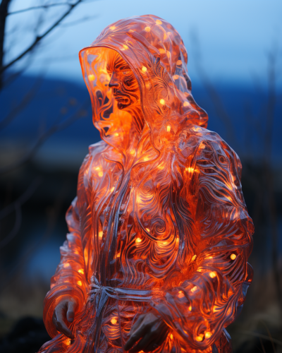 hi Resolution cinematic photo of an enigmatic woman draped in a flowing black cloak, her silhouette hauntingly framed against the murky backdrop of fog-laden woods. In her grasp, she clutches a lantern emitting a dim, otherworldly glow. The winding path beneath her feet twists through the eerie forest, the gnarled trees reaching towards the heavens, their branches casting elongated shadows that dance in the ghostly fog. The ambiance is one of mystery and suspense, as if the woman is a spectral guide navigating the ethereal realms of the haunting, dim-lit woods. --v 6.0