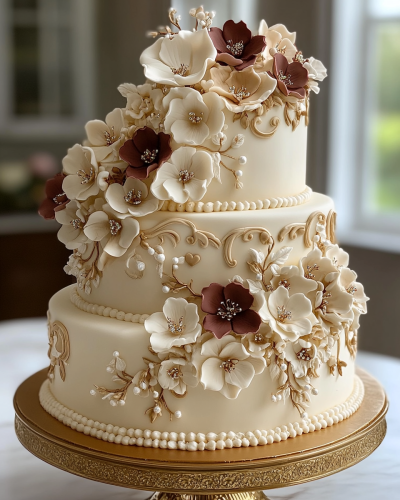 Create a beautiful cake honoring the design of Iolani Palace in Hawaii. The base cake is Vanilla fondant. Use the colors of White, Beige, Brown and Gold. Victorian Rococo Regency Era Design Styles. Focus on replicating Iolani Palace of Hawaii. Use baby roses and small orchids. Use rhinestones and pearls and heart shaped gems. The cake sits on an elegant gold cake stand in a corner on a dessert table in a beautiful ballroom. --ar 4:5 --v 6.1 --stylize 300