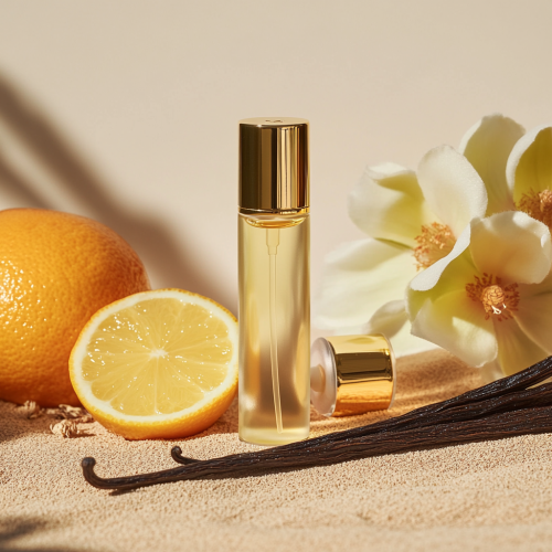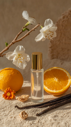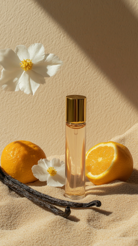 a roller-ball perfume or essential oil bottle with with a gold lid, sitting on a sandy surface, against a neutral background with vanilla stick, a flower and citrus almost touching the bottle, all items appear fully in the frame, product photography, --ar 9:16
