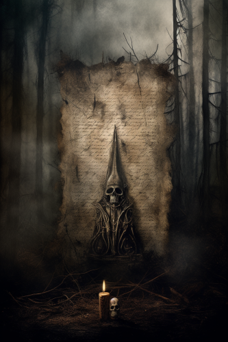 written with pencil on old scorched parchment, old mouth symbol with ancient alphabet spell, forgotten world, very dark, fog, mysterious --v 5.2 --ar 2:3
