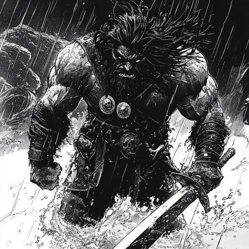 comic, As Zhalakar rose from the depths, the massive tentacles moved through the downpour of the storm, the water steaming as they crushed everything in their path. Korvan, ever ready for battle, stepped out of his cave on Skull Island. He had been waiting for this moment. With his sword in hand and his Soulskull coins carefully guarded in his belt, he stood ready to face the monster. But there was something different about Zhalakar this time. Its eyes shone with a different kind of power, one that Korvan didn't recognize. It was as if the very souls in the coins attracted the monster and gave it new power. The captain realized that this was not just a fight for survival, but to protect the very balance between life and death. The Soulskull Coins held the key to this balance, and if Zhalakar got his hands on them, the world would be thrown into chaos. But Korvan was not afraid. He flashed a wild smile, prepared for a grand battle, and threw himself straight into the monster's claws.