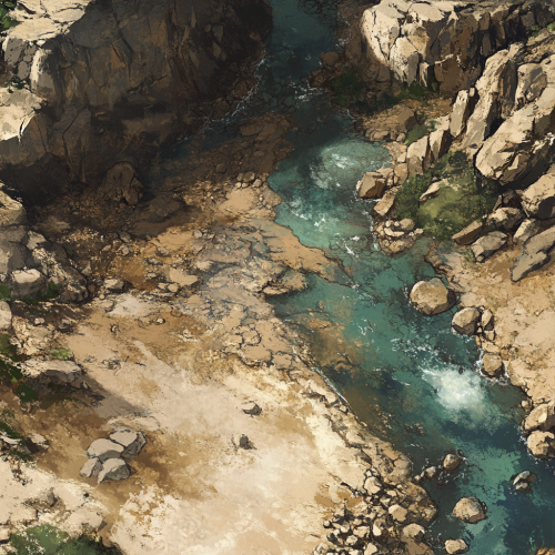 a battle map for DnD of a river bank of a huge river. two thirds of the picture is the river bank with rocks, stones and sand. The other third is the river with some rocks inside. Summer scene.