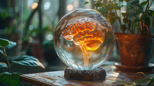 4k ultrarealistic photo of a brain inside a crytsal ball. Warm colors. Background is made up of a futuristic, modern-style office with plants. Blue and light orange colors present, but not dominant. --ar 16:9 --stylize 500 --v 6.0
