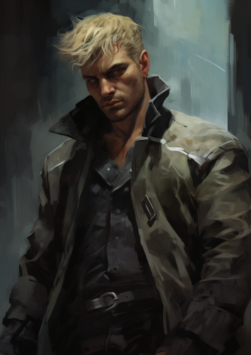 Character RPG, Man having a tall, muscular figure in the heart of darkness with a brooding look. His appearance is that of a deficient man, worn by hardship, with messy blond hair and a pale complexion with a bushy beard. His eyes reflect constant wariness and alertness. He wears worn, discreet clothing that allows him to blend into the crowd, absolutely avoiding any distinctive signs.. In Warhammer 40K, medium shot :: in the style Enki Bilal, grimdark :: --ar 5:7 --v 5.2