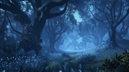 a dark gloomy forest. blue tones. cinematic and photorealistic. --ar 16:9