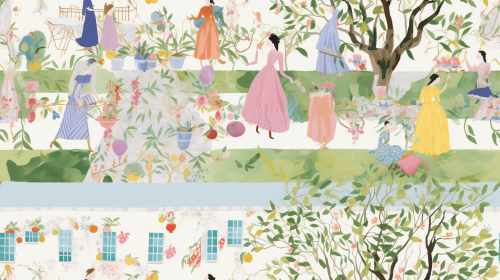 Gouache english garden illustrations, bold color palette,gouache, romanticized country life, --ar 16:9 --tile --style kfbUSyzE