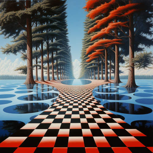 surreal optical illusion, fine art, optical illusion graphic based on a stylised American Flag , geometric illusion in the style of MC Escher, Matisse Palette, dark Rembrandt accents, deep texture , highly detailed hyper-realistic, no blurring, no text, no watermark, no signature, no copyright --v 6.0 --ar 7:5 --c 5 --no borders, frames, split frames --weird 200