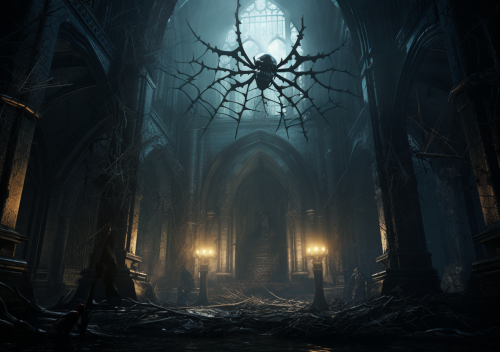 spiders in gothic church, concept art, fine-detail, dramatic lighting, cinematic, detailed, dark dramatic atmosphere, mist, fantasy, magic, digital art, d&d, stylize, breath of the wild, intricate detail, 8k octane, --ar 10:7