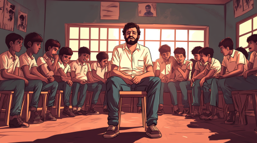 A teacher sitting on a chair in the center of an Indian classroom, surrounded by students forcing him to resign. The teacher is crying down his head, while the students smile with mischievous satisfaction. The scene has a comic caricature style, with exaggerated emotions, using only two colors (either black and white or warm tones), capturing the sad and intense atmosphere of the moment. --ar 16:9