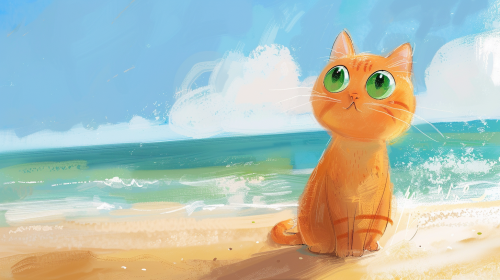 a happy orange cat with big green eyes on the beach, whimsical cartoon style, soft rounded shapes, exaggerated facial expressions, bright and playful colors, soft lighting, joyful and fun --v 6.0 --ar 16:9
