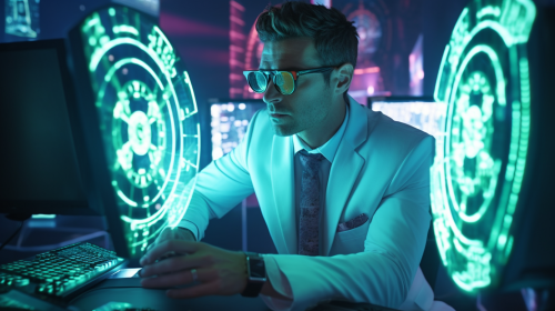 a man trading cryptocurrencies in a million dollar house. He's well dressed and has lasers shooting out of his eyes. 4k resolution. Hyperrealistic. Shot on a Canon. --ar 16:9