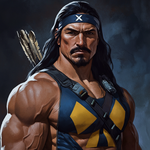 superhero, 35 year old male, Cheyenne, medium long thick black hair, mustache, tan and olive skin tone, high cheekbones, very muscular, thick arms and chest, native American headband, confident, ruggedy handsome, very masculine, covert mission ops leader, 80's gym coach clothes mixed with tactical gear, guns holstered, X-Men X logo, secret covert ops headquarter environment, photoreal comic book illustration