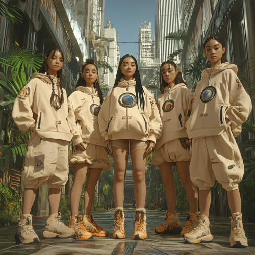 an urban tribe in a futuristic cyberpunk world. There are 5 people. The symbol of the tribe is a Earth. They wear beige outfits with the symbol of the tribe. Background is a tropical city.