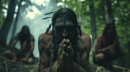 Closed Up of Ancient Tribe in German woods during late Paleolithic Era praying to a scary Shamanic Demon while high on drugs, cinematic, photorealisitc, vivid colours, endlessness, ethereal, dreamlike, film grain, --ar 16:9