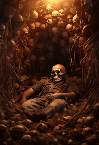 Wide shot of a dark, expansive cave with a towering, rocky hill at its center. At the top of the hill lies the body of a Chinese soldier in worn power armor inspired by the Fallout universe, with a dim glow reflecting off the armor’s edges. Next to the soldier’s outstretched hand rests a pistol, partially covered in dust. The cavern is shadowy and atmospheric, with a sense of ancient decay and mystery, faint light filtering through cracks above, casting eerie shadows across the rocky landscape.