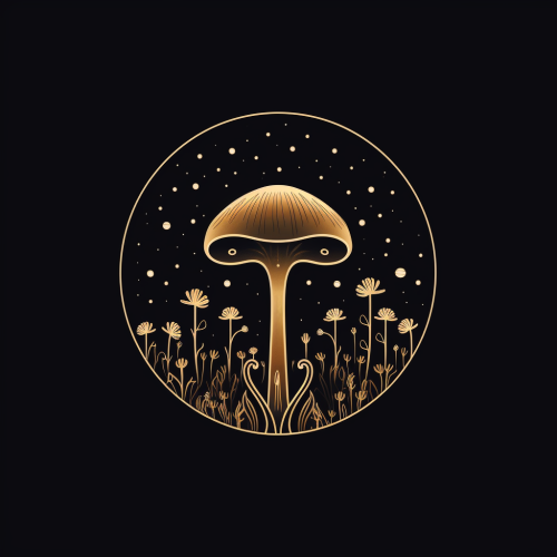 (masterpiece, stunning logo, minimalism, high image quality:1.2), minimalistic circular logo of ancient herbs glowing with life and magical fungi helps the enriches soil communicate with eachother
