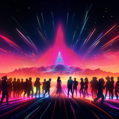 large scale festival in a desert with dancing people in the background wearing neon colors black red and blue 8k uhd ultra clear bright neon
