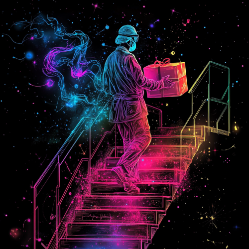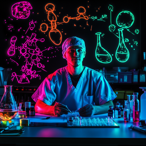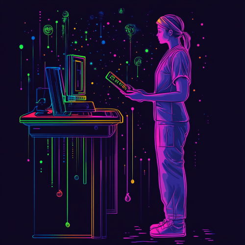bright neon sterile processing technician, fighting microbes, stocking a shelf with medical packages, neon sparks, outline drawing, glowing colour, black background with neon nebula