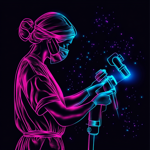 bright neon sterile processing technician, fighting microbes, cleaning medical devices in a sink, neon water drops, outline drawing, glowing colour, black background with neon nebula