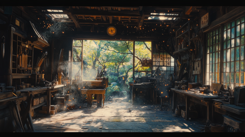 Inside a swordsmith workshop deep in the mountains of Japan. It's hot and the air is flickering. Sparks fly. The time is noon. Realistic. --v 6.1 --ar 16:9