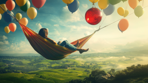 photorealistic. semi close up. of a woman flying through mid air because she is holding on to ballons with one hand. background is a green hilly landscape. --ar 16:9