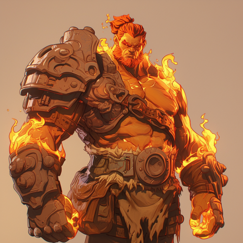 a full body 3D sculpt of a male fire giant, Heat Miser, short muscular body type, Fire hair, warlord armor, created by Follygon and Phil Noto and J. Scott Campbell, 3Dsculpt, dynamic comic pose, cinematic lighting, volumetric lighting, character design, character turnaround, concept art, fire colors --s 250 --niji 6