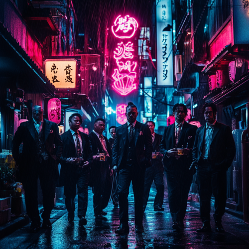 A neon-lit alleyway in Tokyo at night. A group of Yakuza members with tattoos, wearing suits, and holding katanas and sake bottles stand under the glow of neon signs. The atmosphere is tense, with rain-soaked streets and the reflection of neon lights on the wet pavement. Include the text 'ヤクザ - The Yakuza' at the top in an elegant yet intimidating Japanese calligraphy-style font