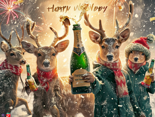 5 Deer (family father, mother and 3 children) in winter coats ceremoniously opening a big bottle of champagne to celebrate New Years Eve 2024 + perfect photo + funny + Taken with a Sony camera + fireworks in the background + In the sky the inscription "Happy New Year 2024 !" + realistic photo --ar 4:3 --v 6.0