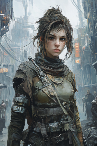 a full body shot of a female grimdark downtrodden street civilian. She has scruffy hair and wears grimdark civilian clothes. In the background is a grimdark hive city. digital painting --ar 2:3 --v 6.1 --no marine