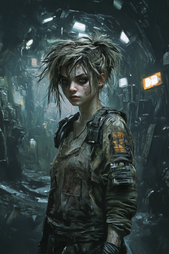 a full body shot of a female grimdark downtrodden street civilian. She has scruffy hair and wears grimdark civilian clothes. In the background is an underground dark grimdark hive city with llights. digital painting --ar 2:3 --v 6.1 --no marine