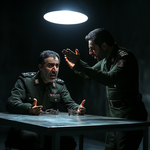 A dark, tense interrogation room in Iran, with a normal civilian sitting at the table, their hands in handcuffs, illuminated by a single, harsh overhead light. An IRGC officer in military uniform is aggressively leaning forward, shouting in the face of the seated person, one hand slamming down on the table, the other pointing at them. The officer’s expression is furious, eyes wide with intensity, creating a terrifying and intimidating presence. The room is stark, cold, and minimalist, with concrete walls. High contrast lighting, cinematic tension, and a moody atmosphere, capturing the fear and intensity of the civilian being interrogated