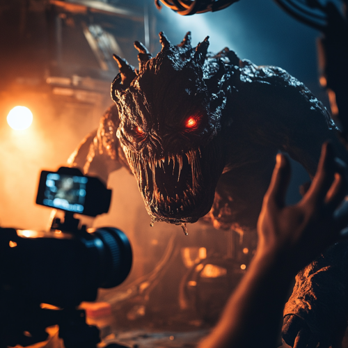 a first person shot of someone with their arm reached out recording a growing monster. Also focused in the image should be a camera crew causally setting up lights and cameras clueless of the looming monster because they are solely focused on the production value rather than delivering the news
