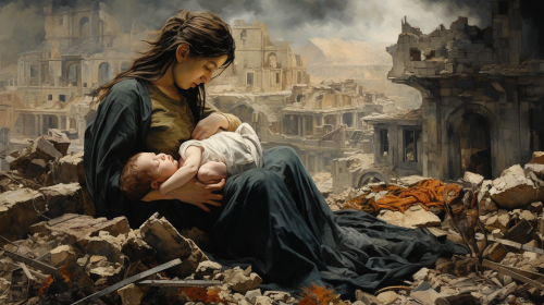 A city that was destroyed in the war, a bird's eye view, there is a mother holding a child on the ground, the mother and child are lying down, the mother and child are made of stones and building debris. Be realistic, high quality--s 250 --ar 16:9