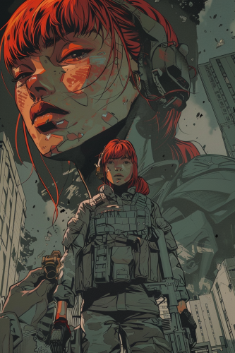 a gray and artistic color comic page, be connected cut scene, concept art style, A ugly Korean male in military background, militaristic realism, korean girl in normal citizen realism, graphic novel, narrative, cyberpunk, etam cru, gray and crimson, Tightly cropped composition, masterpiece novel, high detail --ar 2:3