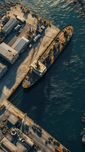 A picture of a large crew ship anchoring in the port from the air. The picture is realistic as if it's real, shot on IMAX Laser --ar 9:16 --v 6.0