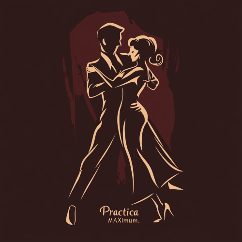 Design a logo for a tango event, a Milonga, with the name "Practica" and the second word "MAXimum." Use a dark maroon background with light-colored text. Include two dancing figures, a male and a female, styled after the artist René Gruau from the 1950s. The woman's portrait should be rendered with just three brushstrokes.