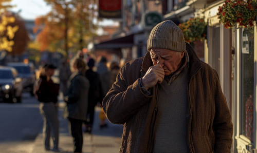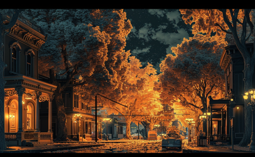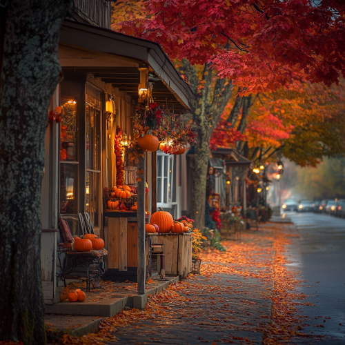 A warm, cinematic photograph of a cozy small-town street lined with towering autumn trees in vibrant shades of red, orange, and yellow. Leaves gently drift down in the soft evening air, creating a colorful carpet along the sidewalk. Rustic decorations and pumpkins adorn each porch, with a slight mist in the air adding to the nostalgic feel. Captured with a Nikon D850 and a 50mm lens, this scene glows with warm, golden light, invoking a sense of peaceful autumn nostalgia.