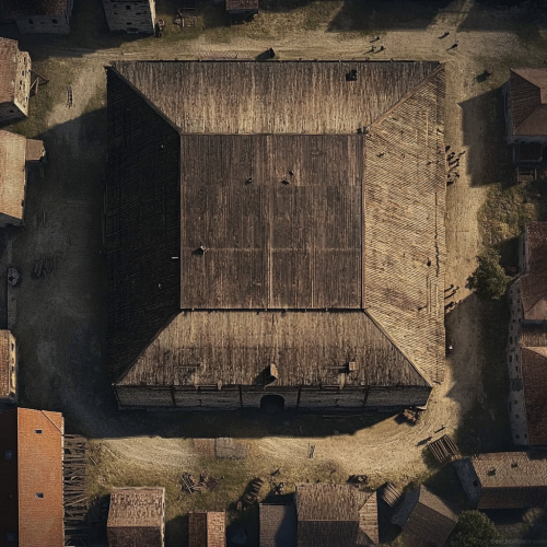 drone view of a a huge medieval granary, 30 meters x 50 meters. A huge wooden building inside a medieval town with small houses that are dwarfed by the granary.