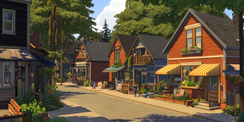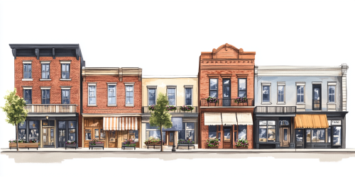 A quaint street scene in a small American town, reminiscent of Seattle, lined with charming two-story buildings.Gorisontal fasade. Each building features unique architectural details, with warm brick and wooden facades in inviting tones. Some houses have cozy balconies adorned with flower boxes, while others display colorful awnings over their front doors. The street is bustling with activity, as locals stroll by and chat with neighbors, creating a friendly atmosphere. Lush trees line the sidewalk, providing shade and a touch of nature, while small shops and cafes add to the vibrancy of the scene. The sun filters through the leaves, casting dappled light on the pavement, evoking a sense of warmth and community in this picturesque neighborhood. --ar 2:1