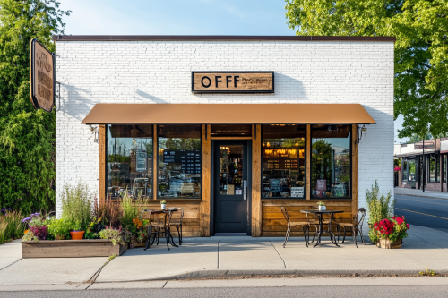 A single-story coffee shop facade in a small American town, reminiscent of Seattle. This charming building features warm, white brick style, rustic wooden siding and large glass windows that invite passersby in. The entrance is framed by a cozy awning in a rich coffee brown, with a welcoming sign displaying the coffee shop's name in a stylish, handwritten font. Outdoor seating is available on a small patio, adorned with colorful potted flowers and wrought-iron tables and chairs. Inside, large windows allow natural light to flood the space, creating a bright and inviting atmosphere. The scent of freshly brewed coffee wafts through the air, and the ambiance is lively yet relaxed, perfect for socializing or enjoying a quiet moment with a good book. --ar 3:2